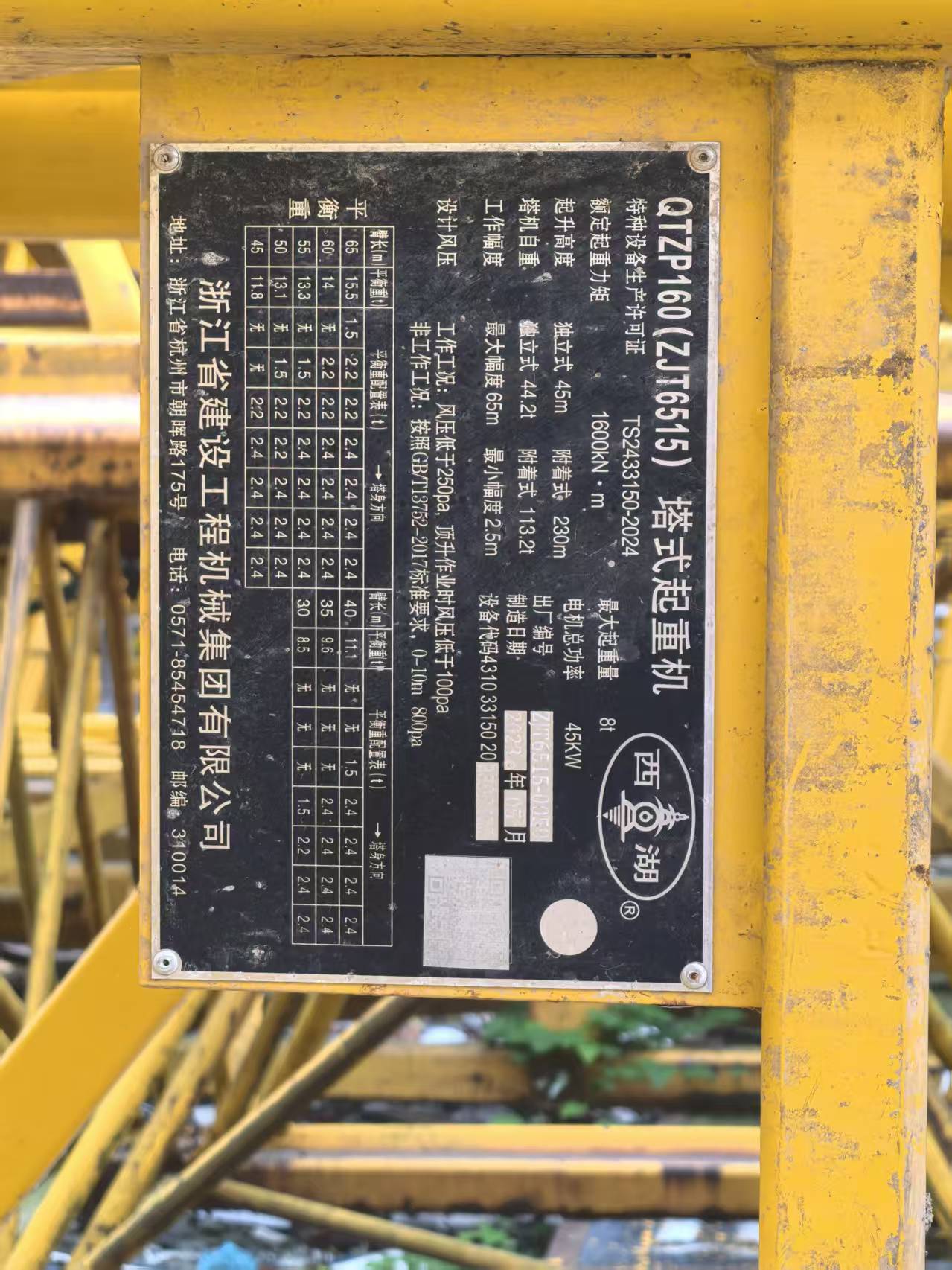 起重力矩 (kN·m):这是塔机能力的核心指标。计算公式为:力矩 = 起重量 × 幅度。QTZ160在65米臂端能吊1.5吨,其力矩为 1.5t × 65m ≈ 97.5 t·m (约956 kN·m),但它的最大力矩1600 kN·m发生在更短的幅度处(例如,在20米幅度吊8吨,20m × 8t = 160 t·m ≈ 1600 kN·m)。塔机的能力曲线就是基于力矩不变的原则绘制的。